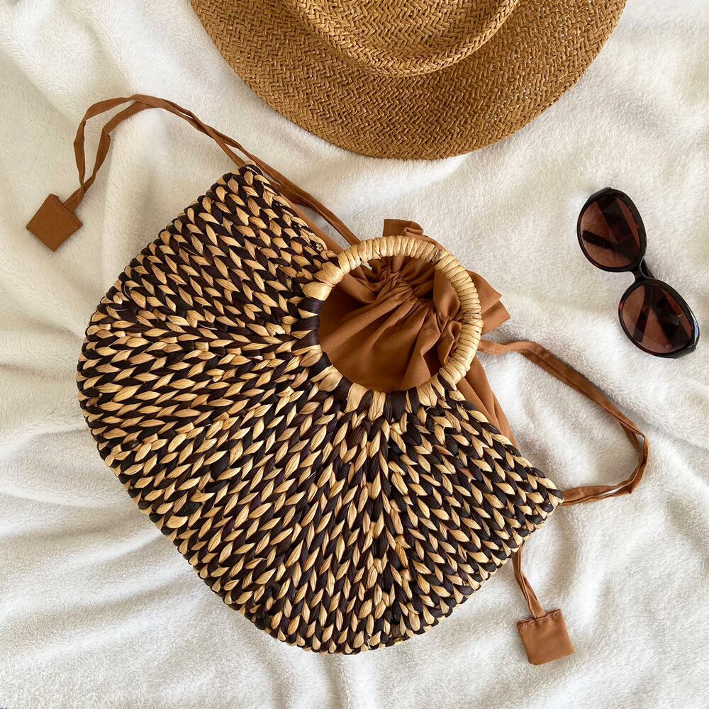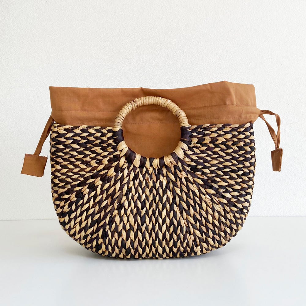 ◈ 素材ならではのナチュラル色にブラックを組み合わせて、インナーにはブラウンの布を使用。大人オシャレなデザインとなっており、人目を惹くこと間違いなしのアイテムです。