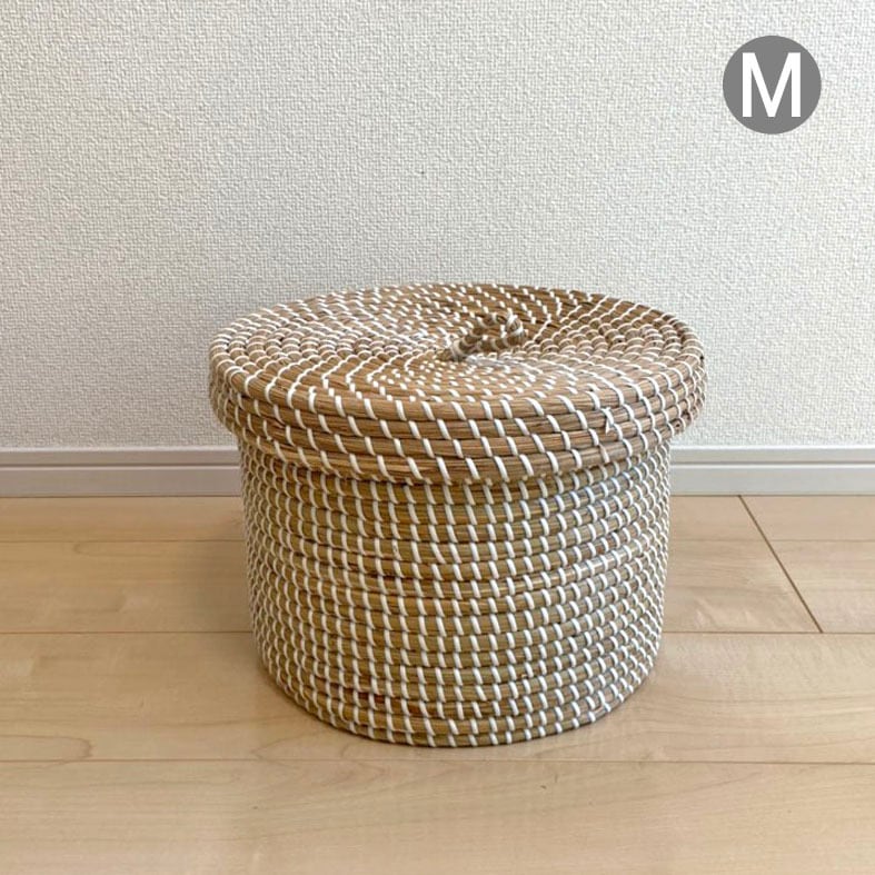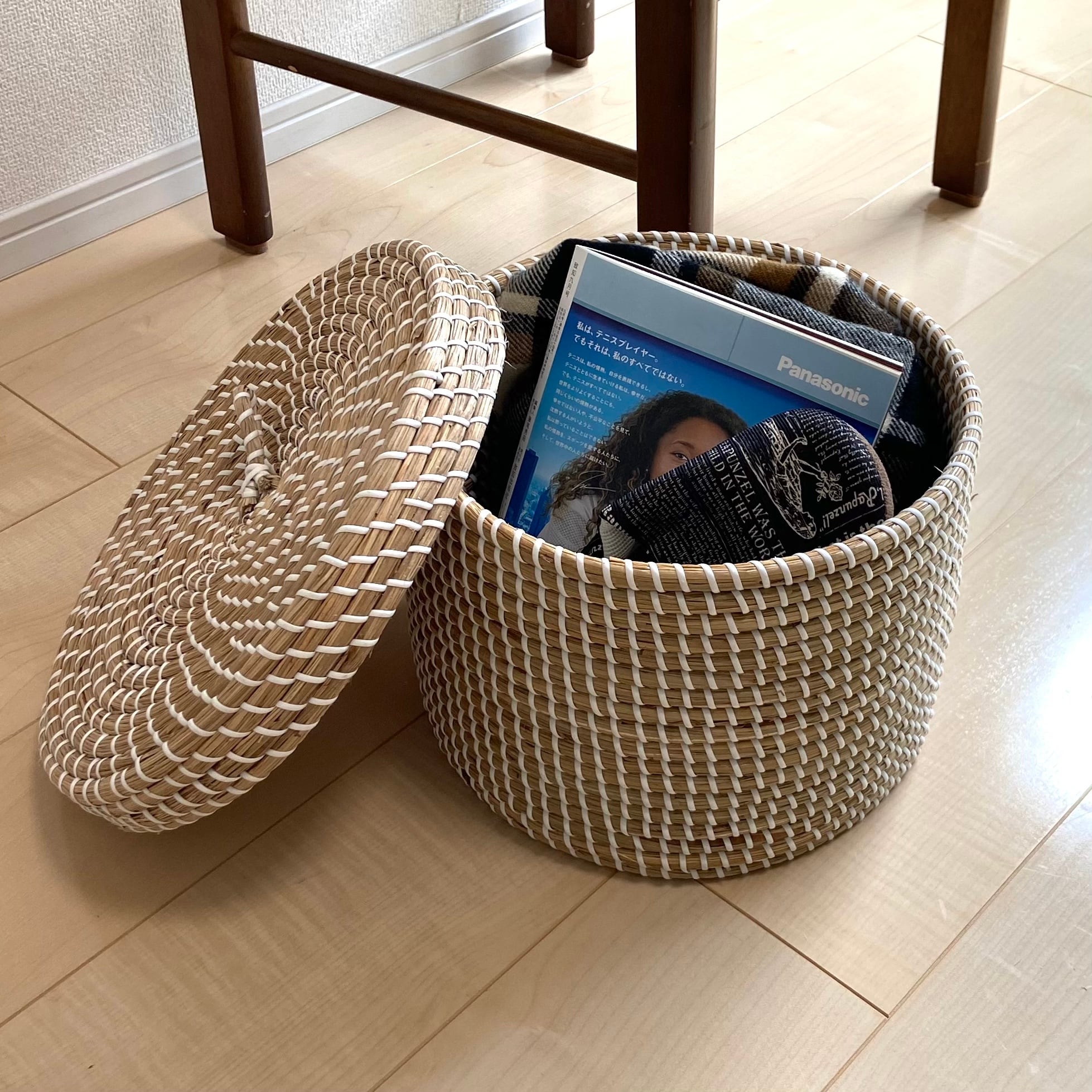 ◈ 天然素材シ-グラスで一つひとつ丁寧に編みあげたフタつきの丸形バスケットです。