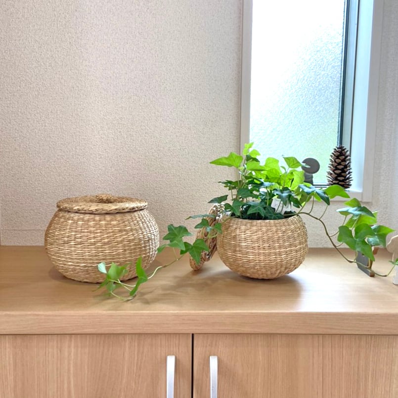 ◈ 天然素材シーグラスで一つひとつ丁寧に編みあげたフタつきのバスケットです。